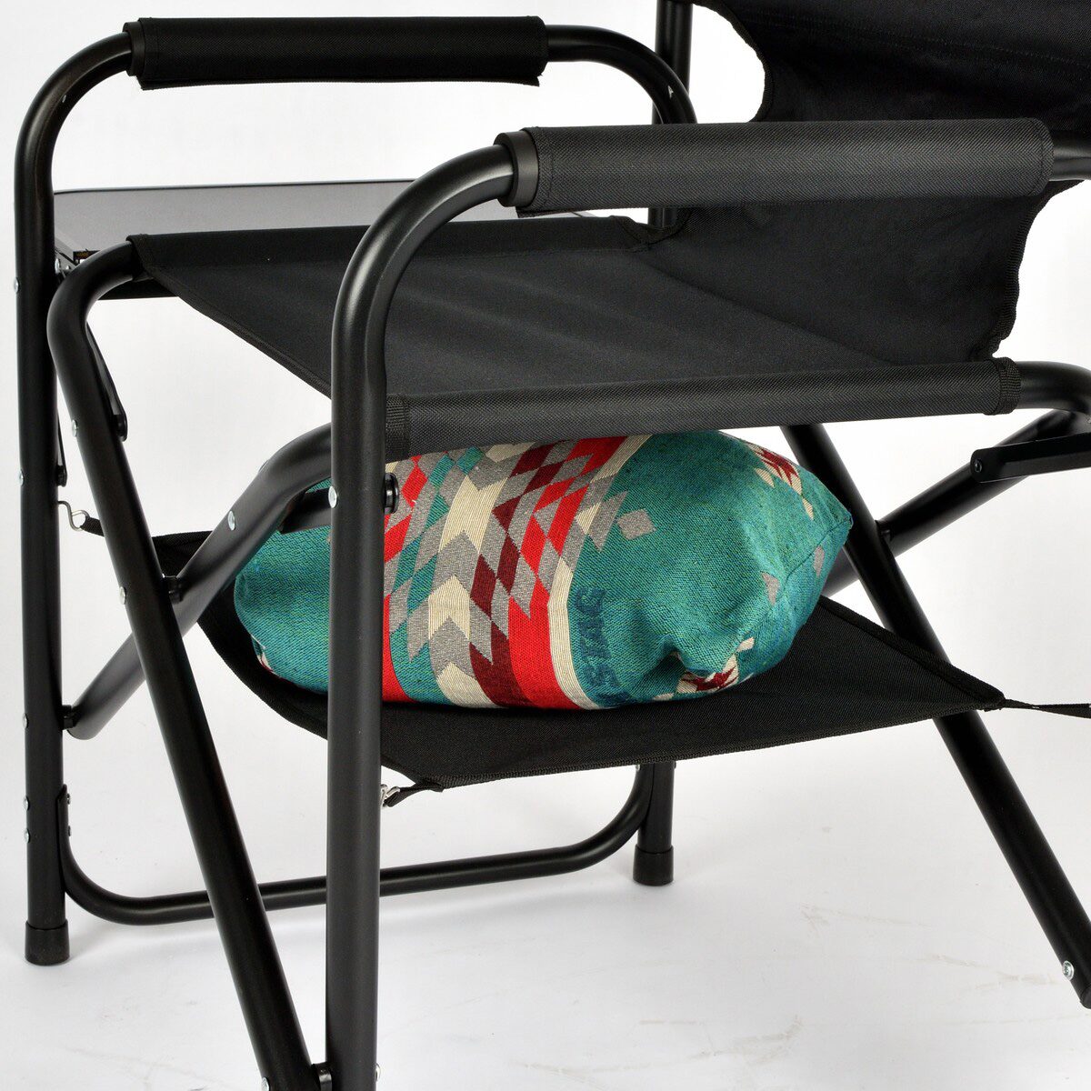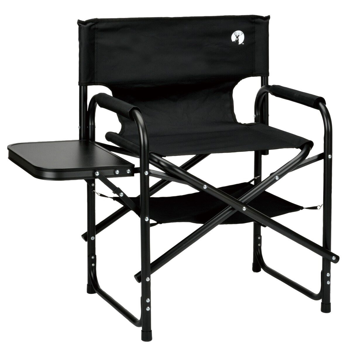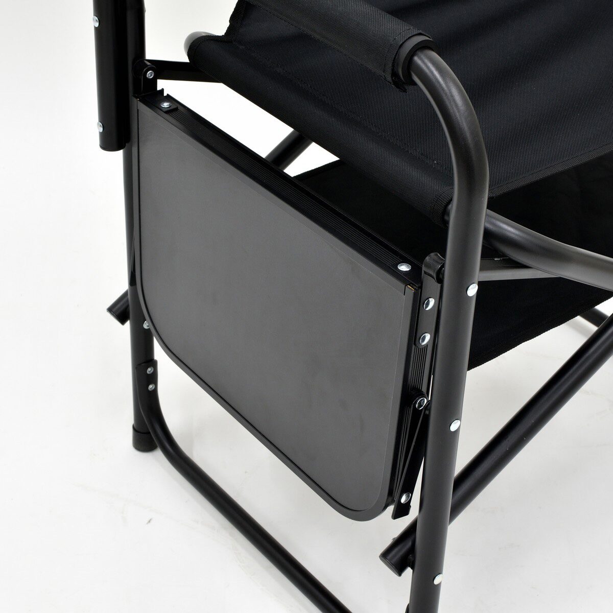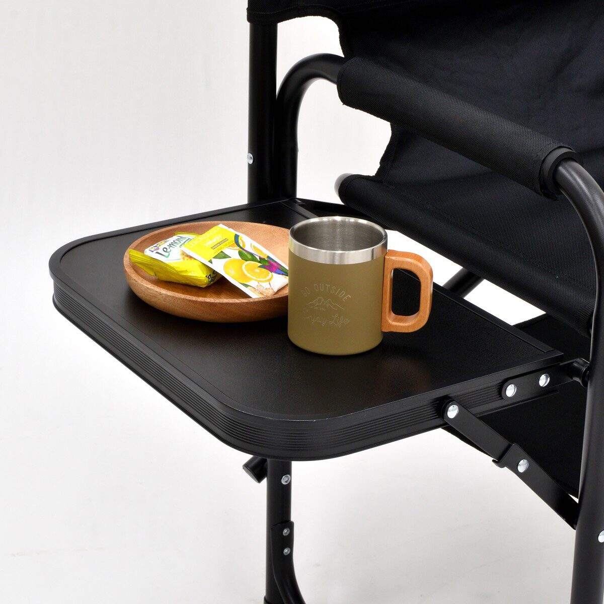 棚モック付きアルミディレクターチェアは、座面下の棚モックと、折りたたみ式サイドテーブルを備えたアルミディレクターチェアです。