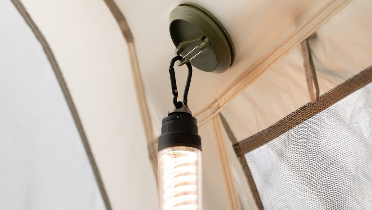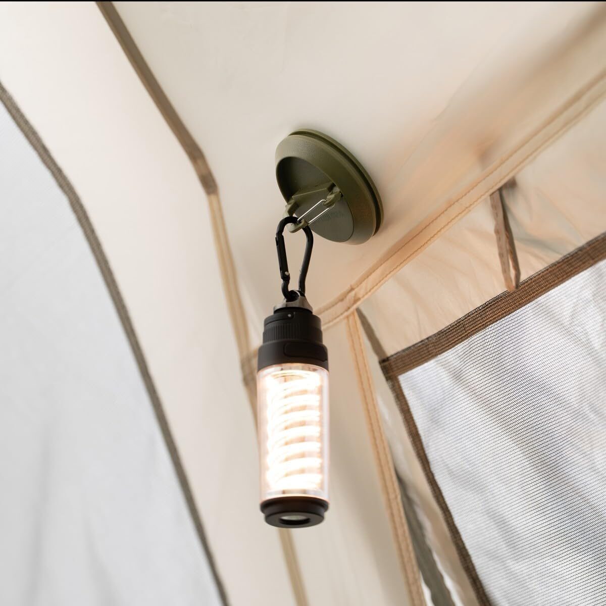 テントやタープの生地を挟んで使用できるため、カラビナなどを取り付けるホールがない場所にもランタンなどを吊るすことができます。