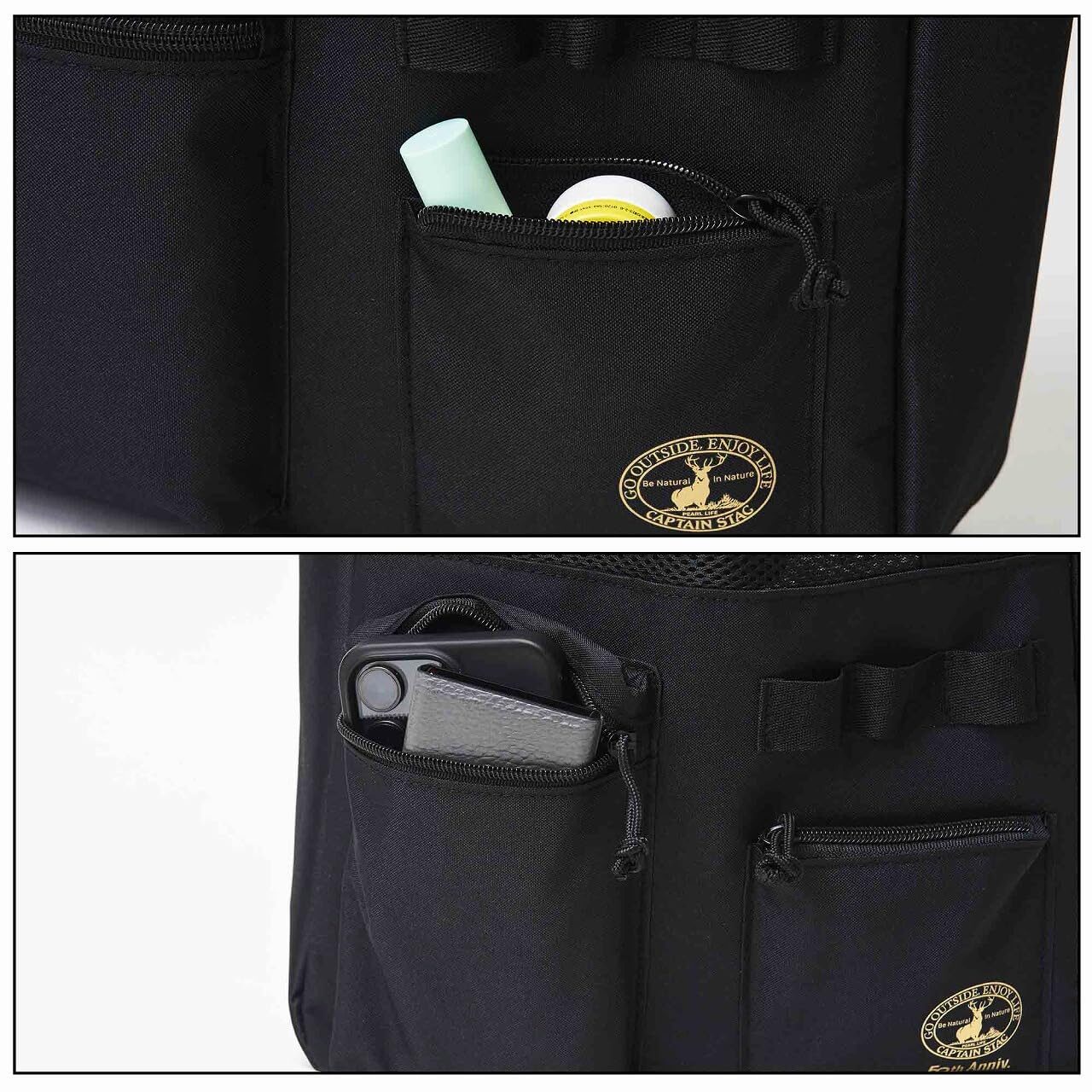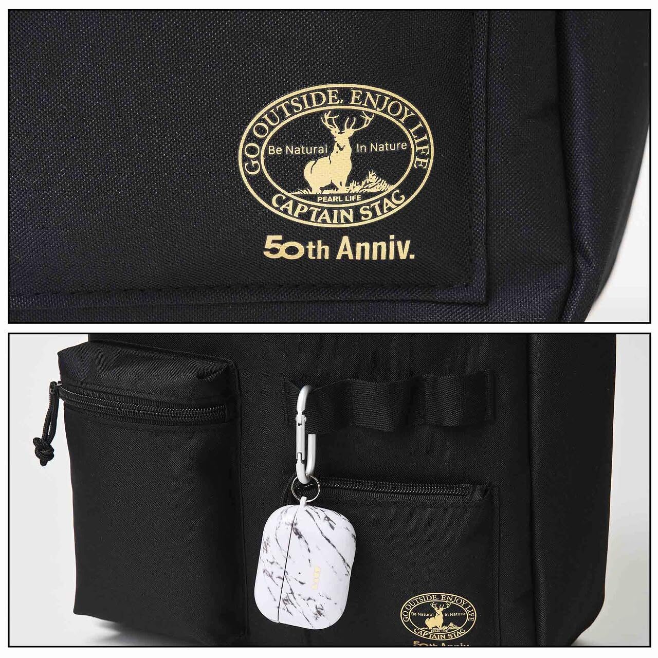 50周年を迎えるキャプテンスタッグの特別ロゴがトートバッグのコーナー部分に配置されています。カラビナが付けられるウェビングテープが搭載されており、小物を吊り下げることができます。