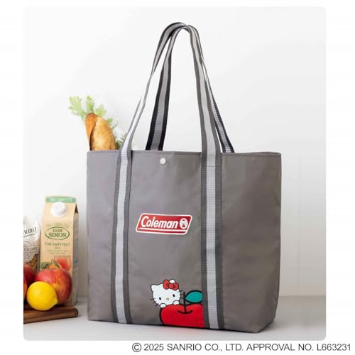 今回InRed(インレッド)2025年12月号の付録としてついてくる「たっぷり入る! 長い持ち手で肩がけできる大容量トートバッグ」は、コールマンとハローキティのコラボアイテムです。赤いりんごにつかまる姿が愛らしいハローキティのイラストがバッグの中央下側に描かれています。