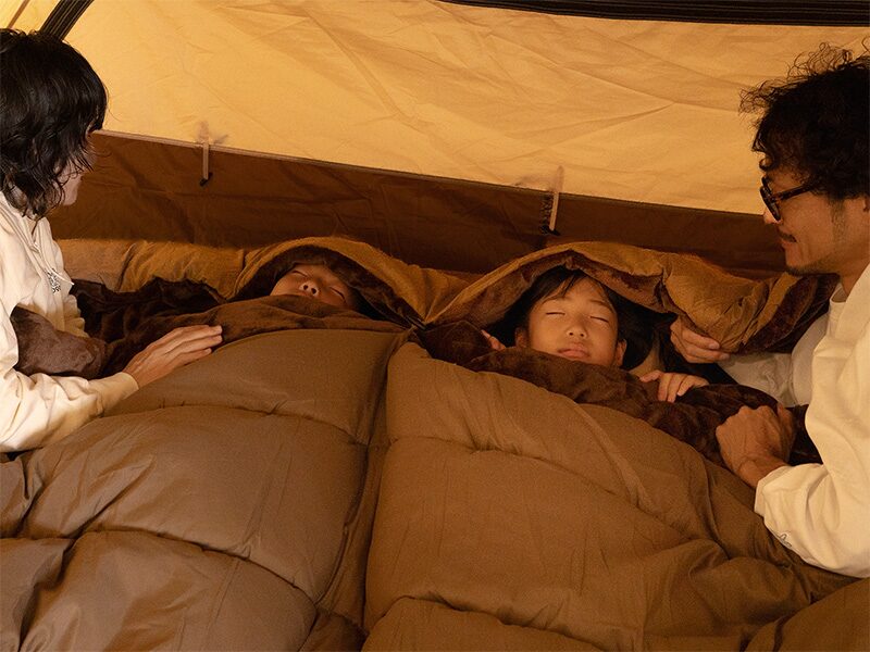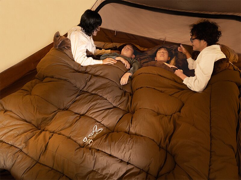 わがやのシュラフRICHは、幅230cmの圧倒的な広さで、家族全員を一枚で包み込む最大4人用のシュラフです。どんな寝相のお子様でも、はみ出す心配はもうありません。親も朝までぐっすり眠れます。