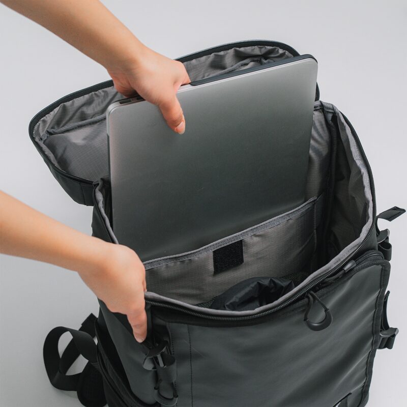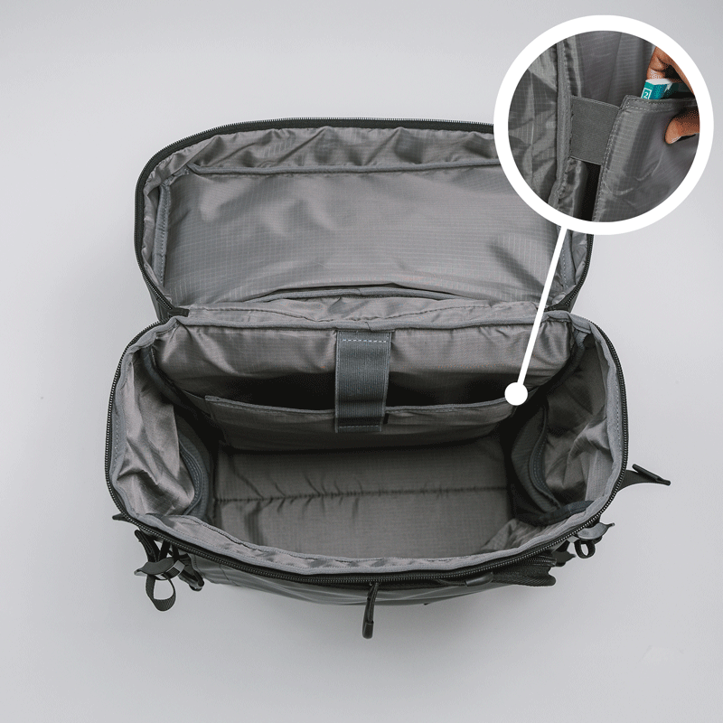 通常のバックパックのように、上からだけでなく、前面が大きく開く2WAY構造を採用しています。