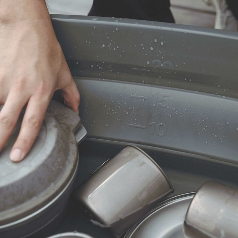 水をはって使った食器を入れておけば予洗いできます。タブの内側にはメモリが記載されており、水の量を計量できます。
