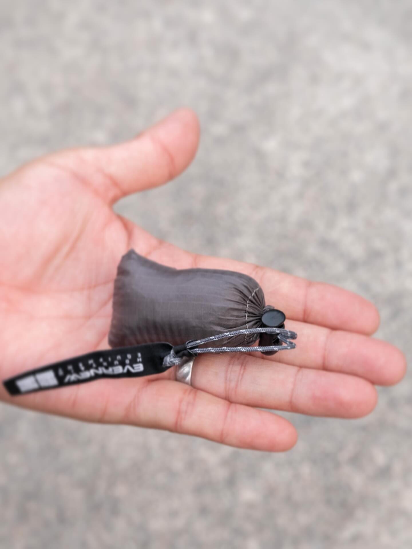 収納時は親指サイズで、バッグの隙間やキーホルダーにも収まるほどのコンパクトになっています。山行時の予備バッグとしてはもちろん、日常の買い物や下山後の温泉にも活躍します。