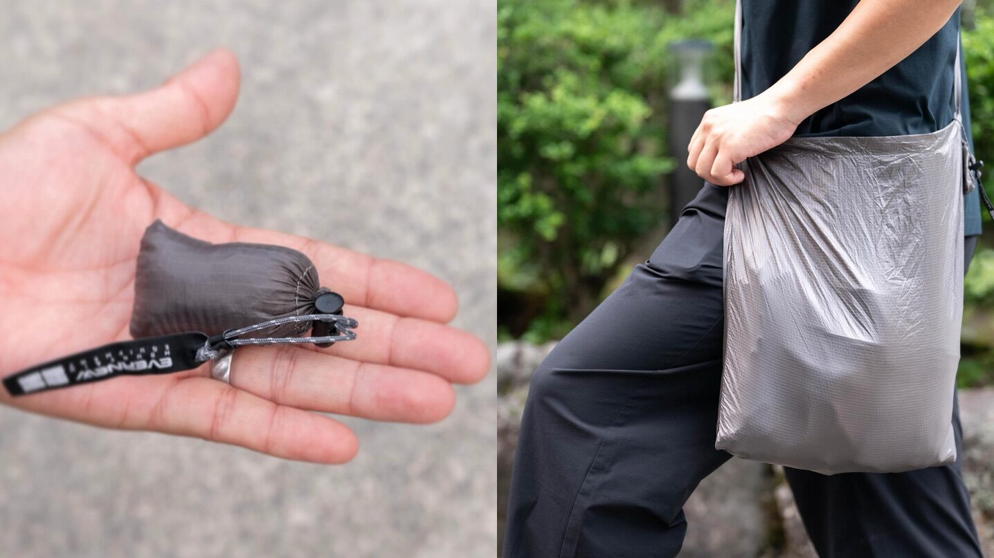 収納時は親指サイズで、バッグの隙間やキーホルダーにも収まるほどのコンパクトになっています。山行時の予備バッグとしてはもちろん、日常の買い物や下山後の温泉にも活躍します。