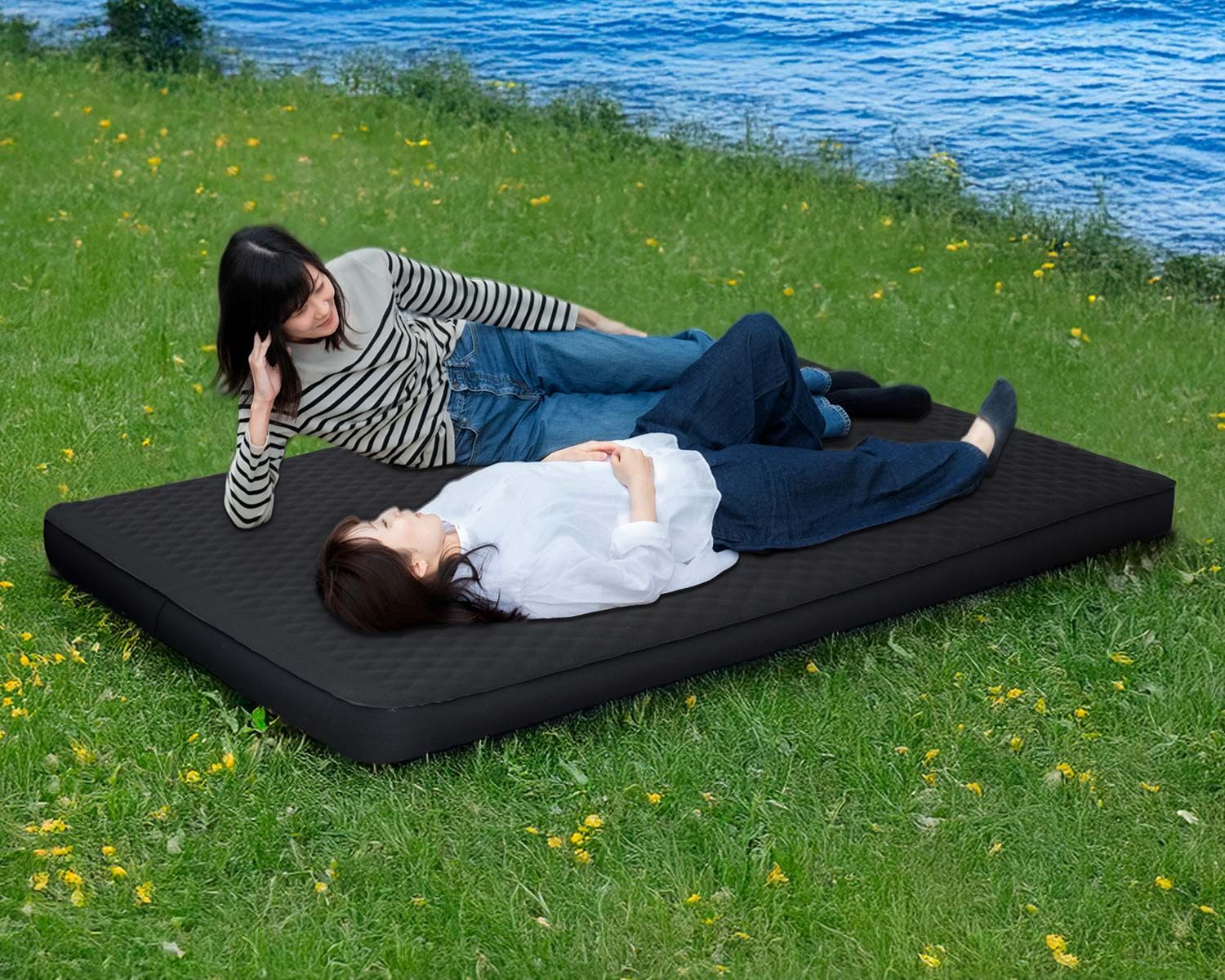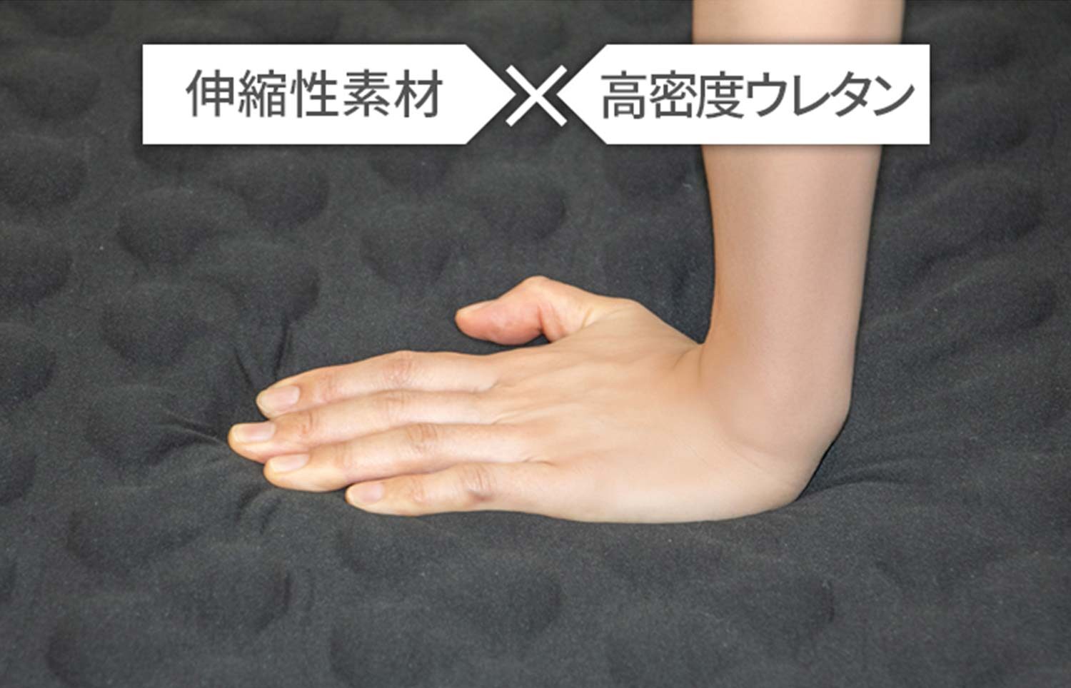 USB充電式電動ポンプ内蔵インフレータブルキャンプマットは、高密度極厚ウレタン10cmで快適に休めるキャンプマットの新商品です。表面の伸縮性素材と高密度ウレタンの組み合わせで、従来にない弾力ある寝心地を実現しています。