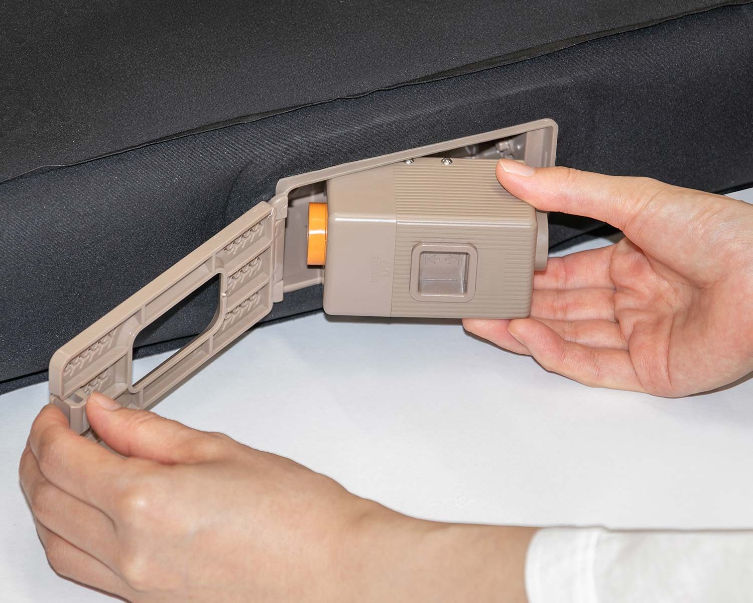キャンプマットは電動ポンプのスイッチをスライドするだけで簡単に膨らみます。収納時も排気側にスライドするだけで空気を抜くことができるため、撤収が非常に簡単です。
