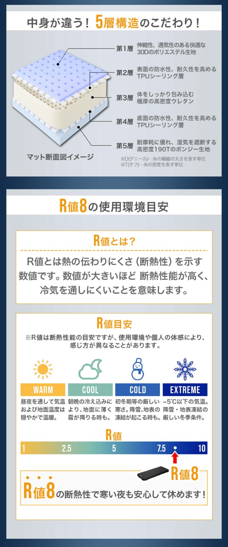 伸縮性・通気性のある表地、耐水性に優れた裏地、TPU層で包んだ高密度ウレタンによる5層構造となっています。マットの断熱性能を示すR値は8.0となっており、冬のアウトドアでも快適に過ごすことができます。