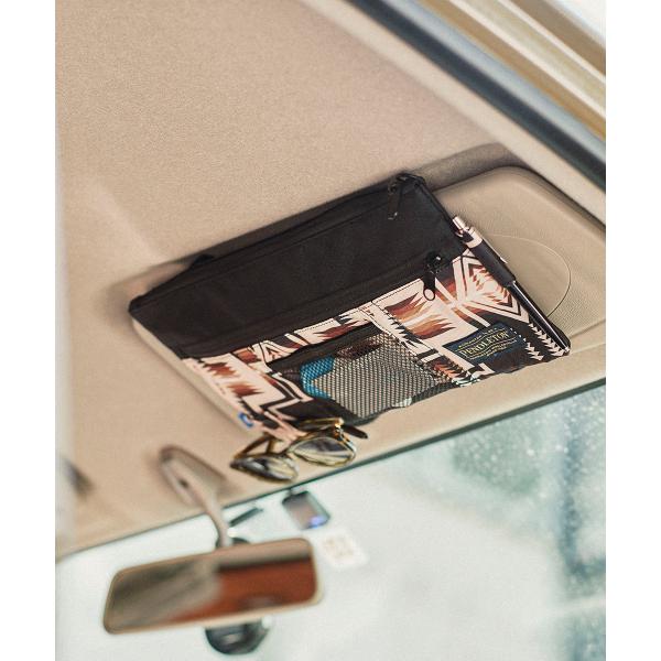 フラット ポーチは、車のサンバイザーにも取り付けられる薄型形状のポーチです。ジッパー付きポケット2室、メッシュポケット、サングラスホルダー、ペンホルダーと収納力が豊富です。