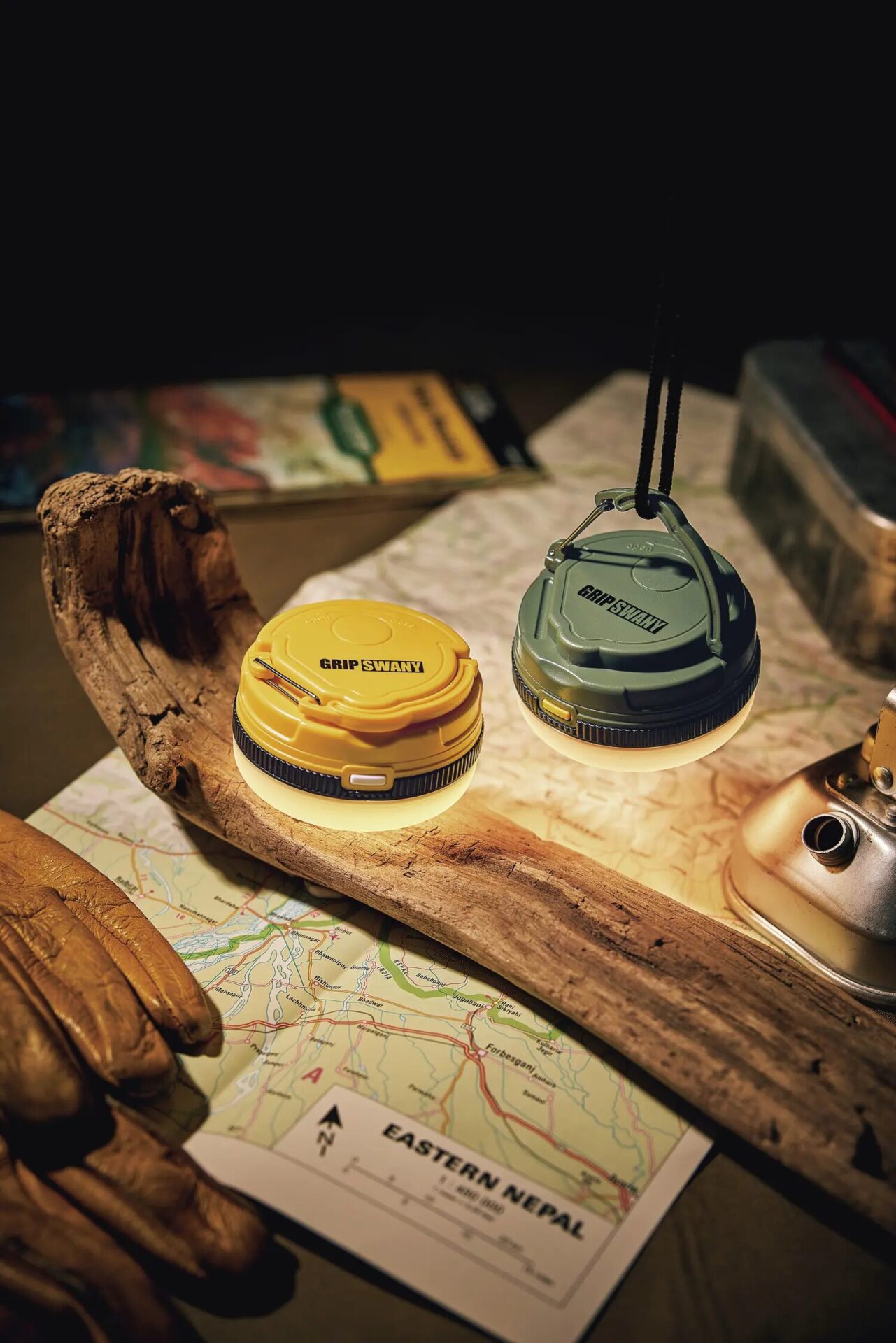 今回BE-PAL 2026年3月号の付録としてついてくる「7機能LEDランタン」は、グリップスワニーとのコラボアイテムです。LEDランタンの中央部分にグリップスワニーのロゴがデザインされています。イエローとカーキの2色どちらかが入っており、カラーを選ぶことはできません。