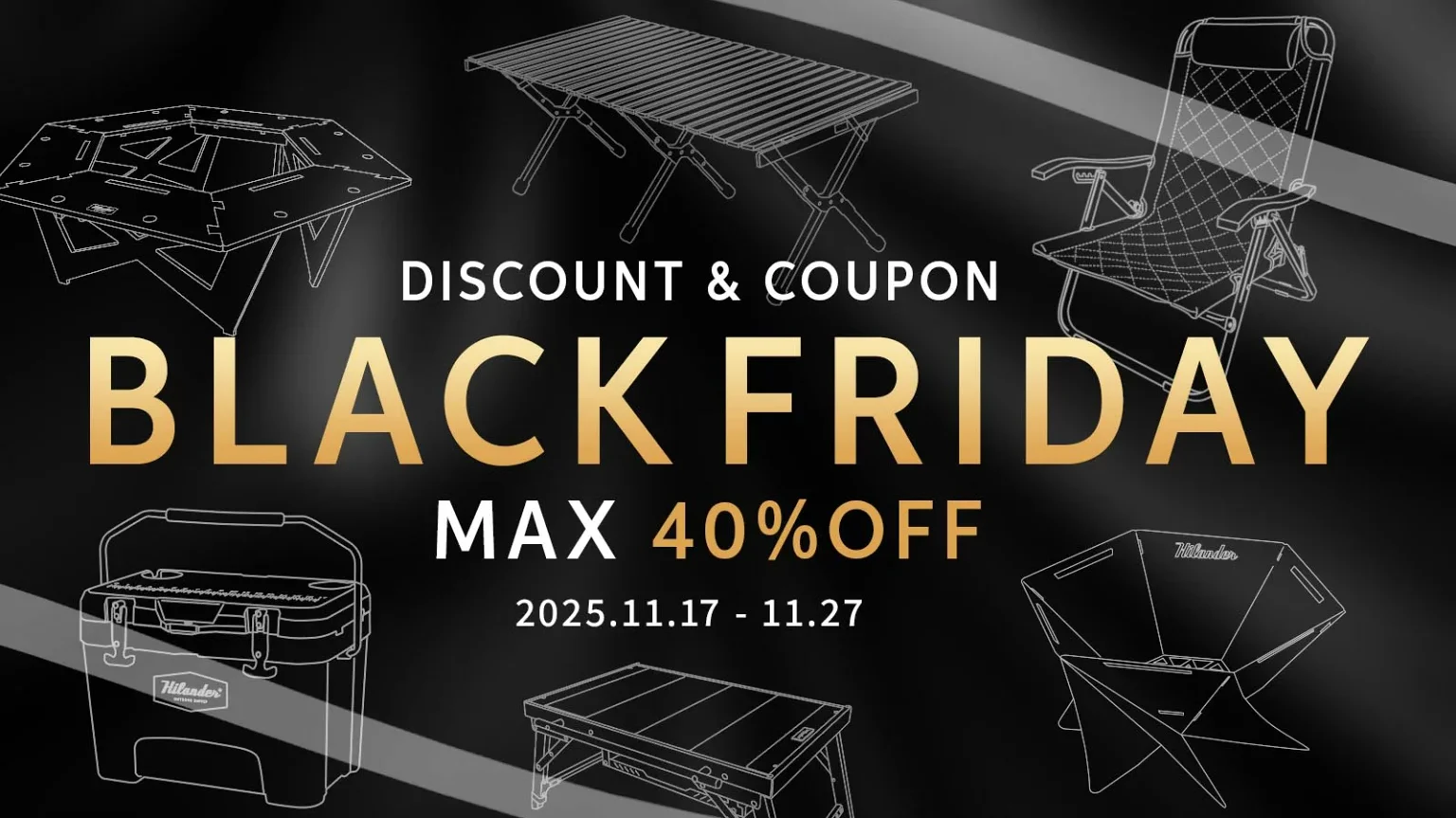Hilandar(ハイランダー)公式サイトとAmazon、楽天、Yahoo!公式ストアにて、2025年11月17日〜12月1日の期間中、ブラックフライデーセールが開催されています。チェアやテーブルなどのファーニチャー類から、焚き火台などハイランダーの人気アイテムがお得に購入できます。詳細をレビューします。