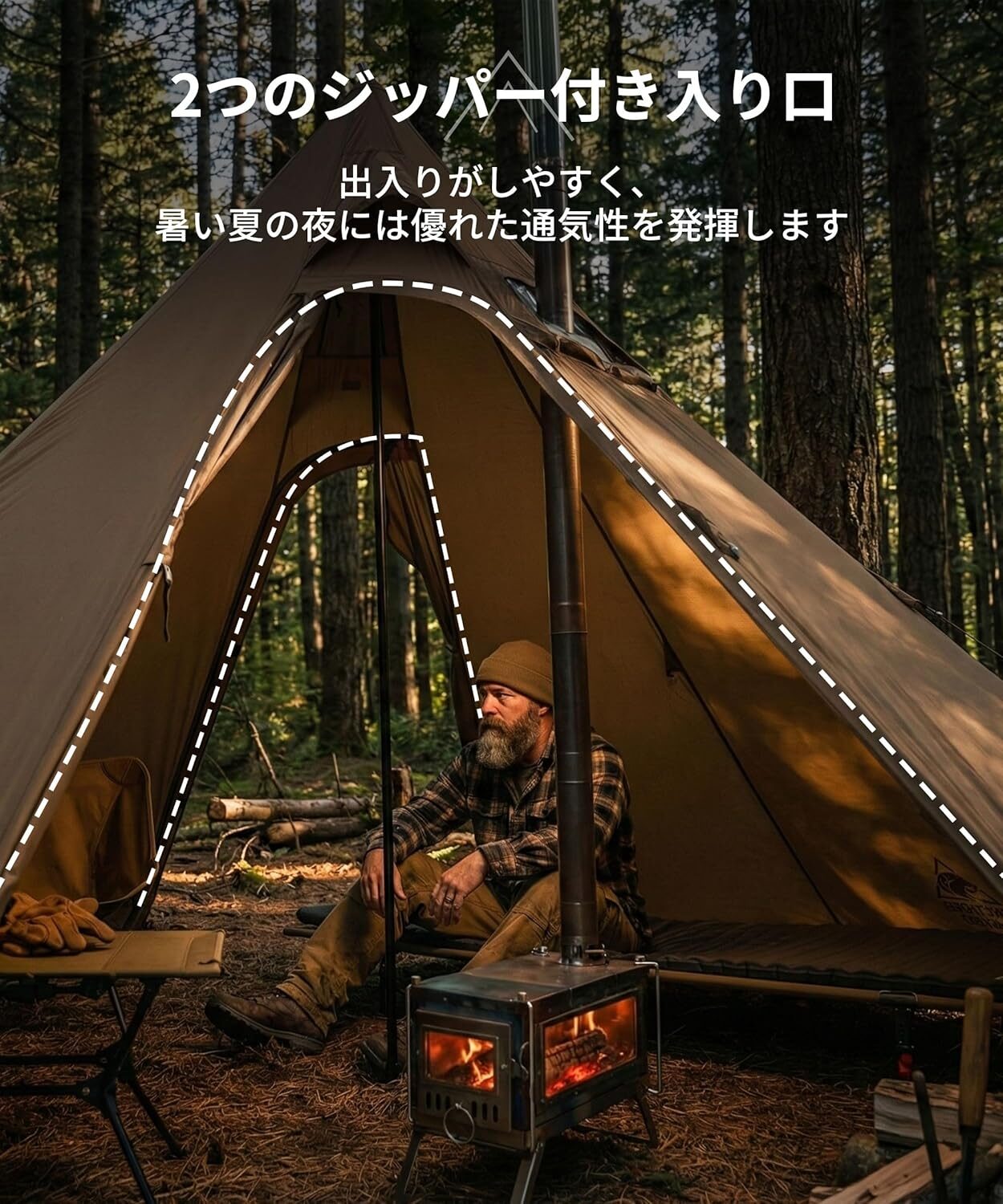 | 付属品 | ガイライン*10 テントペグ*20 テントポール*1セット スタッフサック*1 テント本体*1 煙突ガード*1(煙突の穴の直径:9.5cm) ポジショニングロープ*1 注意:インナーテントは別途購入する必要があります。 |