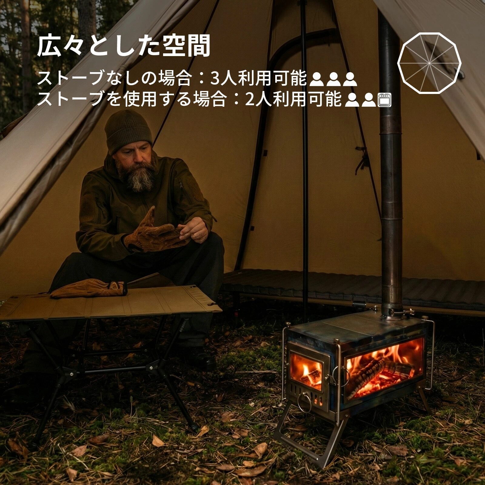 設営時の本体サイズは(約)L360 x W360 x H205cmとなっており、薪ストーブを利用しない場合は3人、利用する場合は2人で使うことができます。