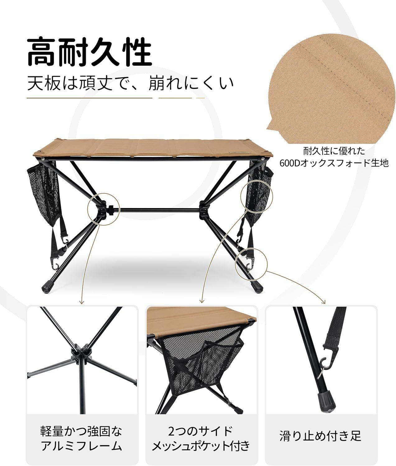 天板の素材は600Dオックスフォード生地が採用されています。耐久性があり、重いものを載せても倒壊しにくくなっています。テーブルの天板には2つのサイドメッシュポケットが搭載されています。