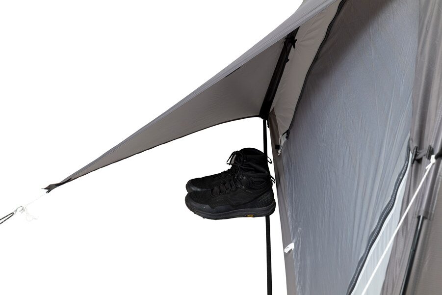 登山靴や装備品をスマートに収容できる独立した前室を確保しています。限られた設営面積の中でも最大限の作業スペースを生み出す、実用的な前室です。