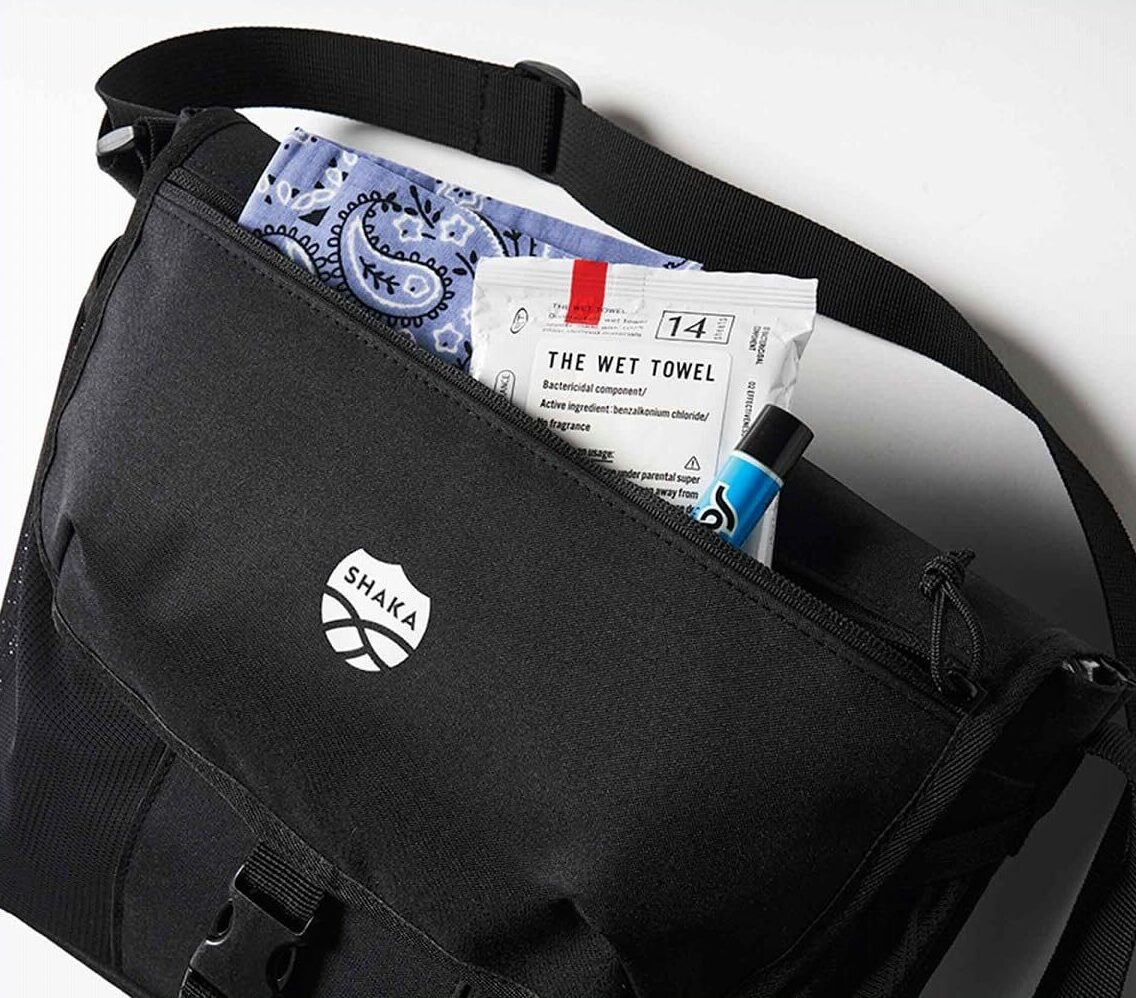 今回MonoMax 2026年1月号の付録としてついてくる「8ポケット付き メッセンジャーバッグ」は、人気のフットウエアブランドSHAKAとのコラボアイテムです。バッグの中央にSHAKAのブランドロゴが配置されています。