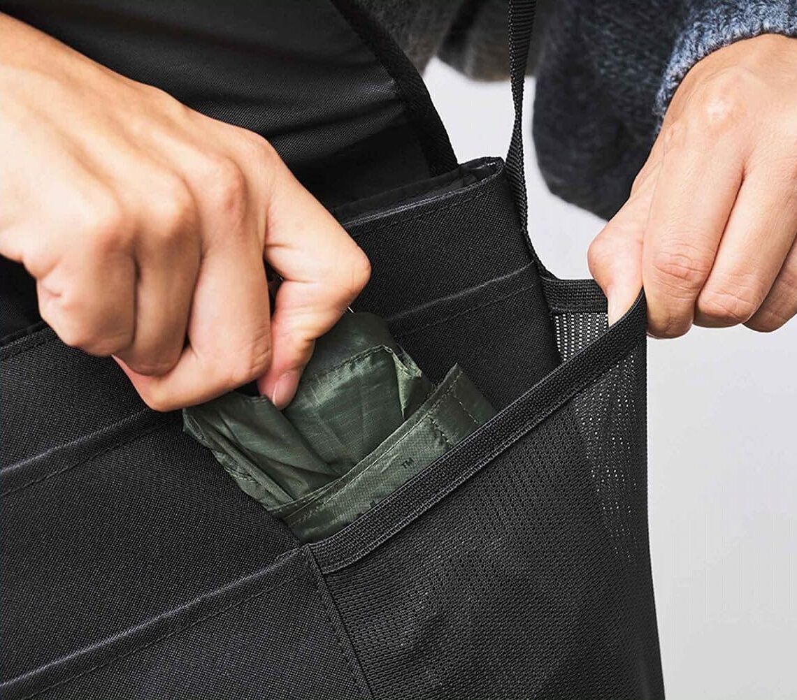 メッシュポケットは伸縮性があり、ペットボトルや折りたたみ傘などを収納するのに便利です。