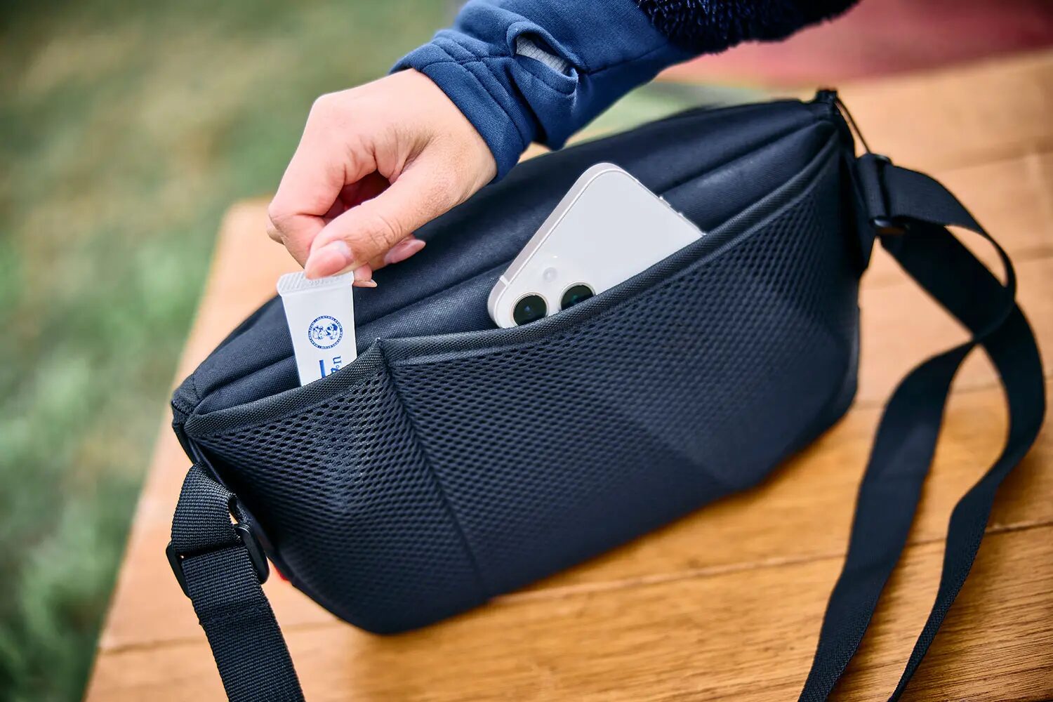 内側には仕切りポケットが搭載されており、文庫本にぴったりのサイズとなっています。本体重量は約100gと超軽量ながら、500mlボトルが2本入る大容量のボディーバッグです。