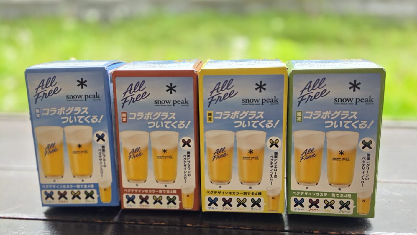 サントリーのオーリフリーを購入すると、snow peak(スノーピーク)とのコラボアイテムがついてくるキャンペーンが始まっています。表面にはスノーピークのブランドロゴ、裏面にはオールフリーのブランドロゴ、側面には4色のペグデザインが描かれた「コラボグラス」もらえるキャンペーンです。詳細をレビューします。