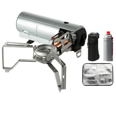 HOME&CAMP バーナー シルバー、バーナーシートL、HOME&CAMPバーナーネオプレンケース、ギガパワーガスCBブタンの4点セットです。HOME&CAMPバーナーに必要な周辺グッズもセットになっているのでお得なセットです。