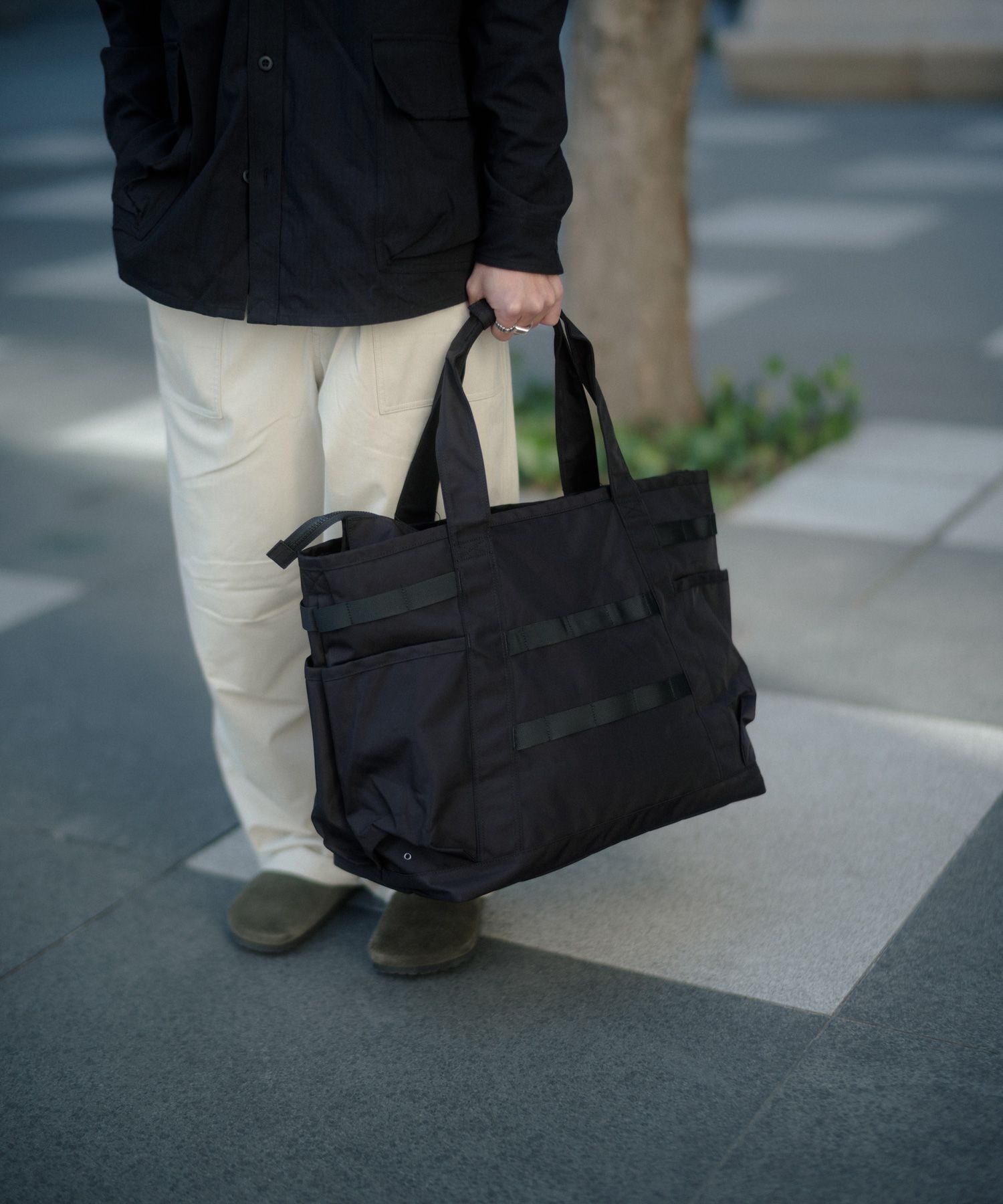 外側にはモールシステムを採用し、用途に応じた拡張が可能です。収納性と使い勝手に配慮した実用的なトートバッグです。