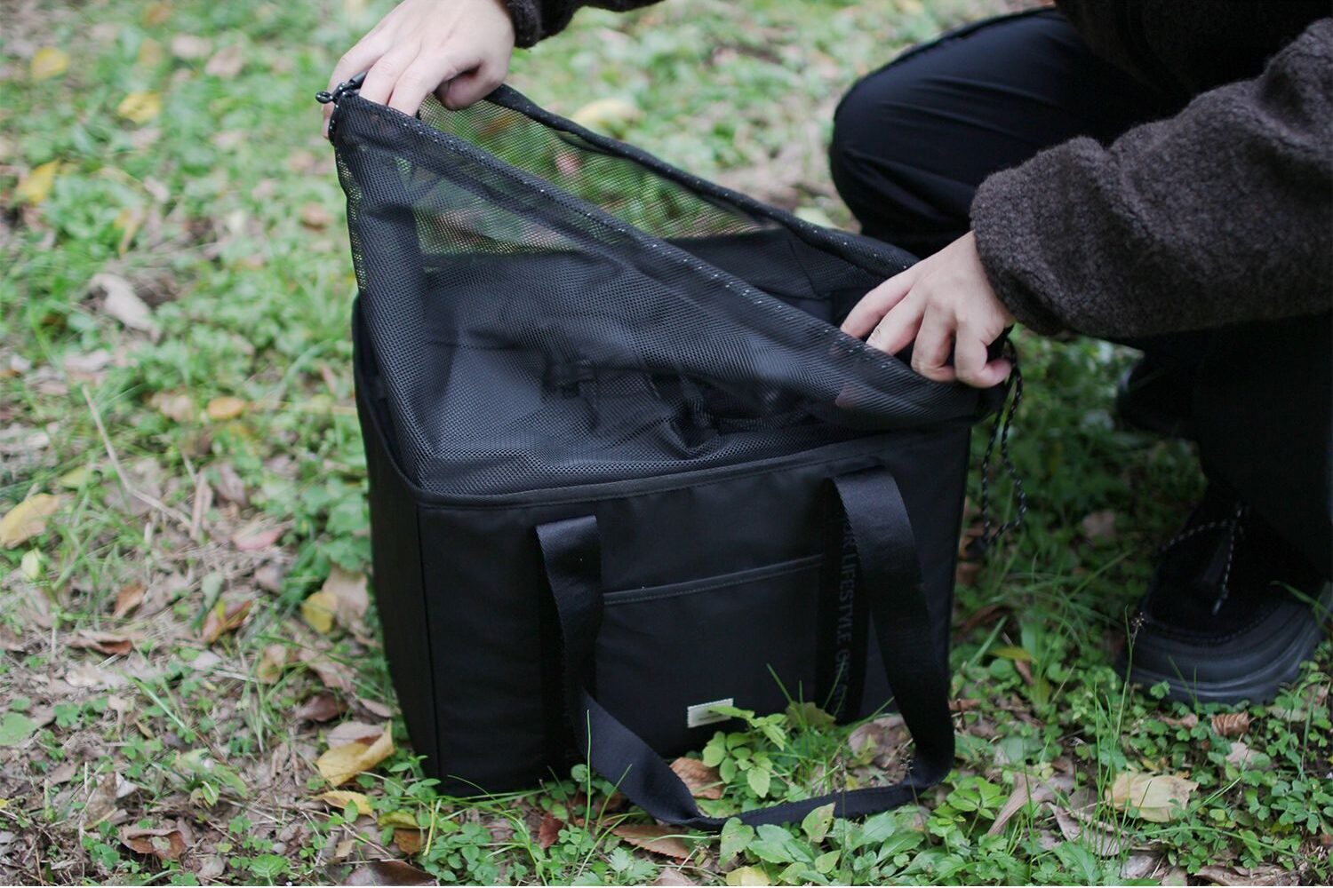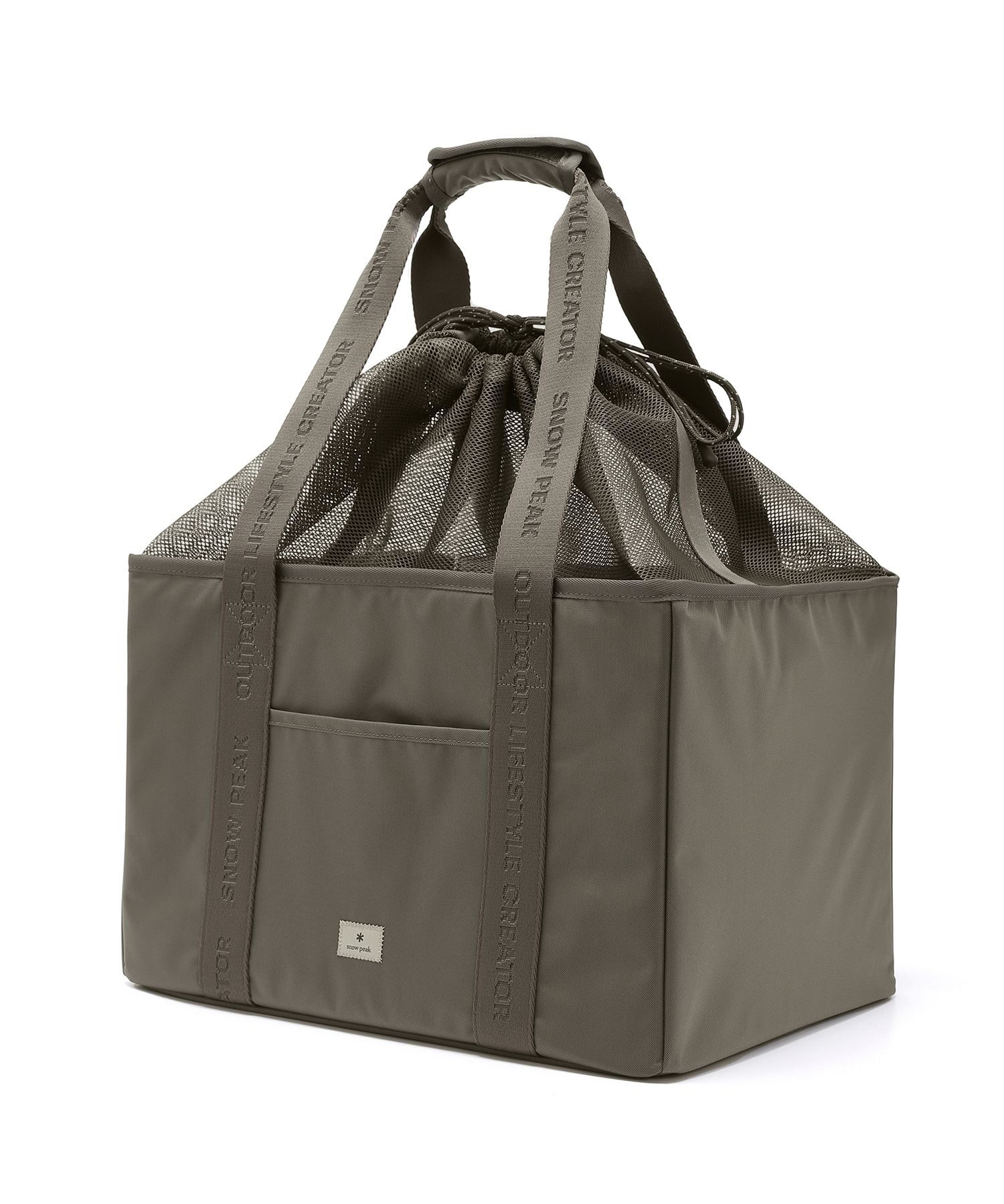 メインバッグは、かさばりやすいギア類の収納に適したストリングクロージング方式を採用し、さまざまなキャンプギアとの連携にも対応しています。
