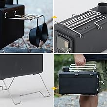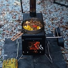 天板上の蓋は着脱可能で、鍋、フライパン、ケトルなどの調理器具を載せ、ストーブの熱を利用して調理が可能です。