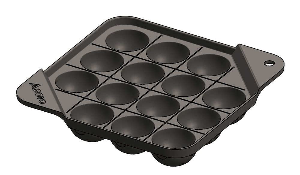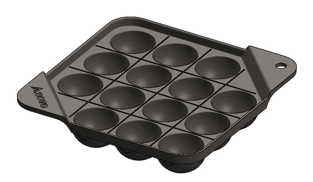 カコムシリーズのたこ焼きプレートです。焼穴サイズは標準的な約40mmで14玉が一度に作れます。焼面には調理しやすい溝加工を施し、ハンドルは製品本体から突起することなく収納できます。