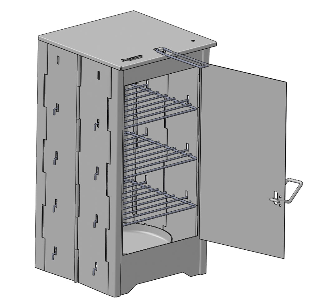 カコムシリーズのスモーカーです。付属する棚板4枚を上段に設置し、別売のST-141フックを使用すれば魚を吊るすことができます。温度計 ST-140(別売)も使える穴加エもあり、高耐久のソロ用スモーカーです。