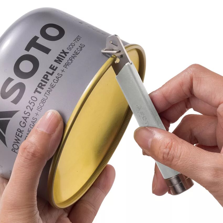 ガス抜きツールは、ガスボンベを廃棄する際に、ボンベ内に少量残ってしまうガスを抜くことができるツールです。缶切りの容量でガス缶の底に穴を開けてガスを抜くことができます。