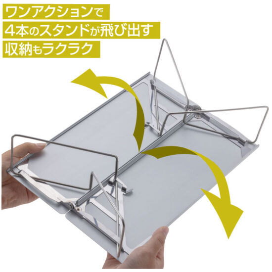 独自構造により、パッと開くだけのワンアクションで4本のスタンドが飛び出すため、テーブルを即座にセットアップできます。