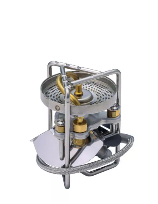ガスを燃料に使う場合は、標準装備のガスバルブを用いて、ガス管を上下逆さにセッティングします。気化ガスではなく、液化ガスを直接バーナーヘッドに送り込む「液出し式」で、連続使用でもガソリン使用時と遜色ない、強い火力をキープできます。