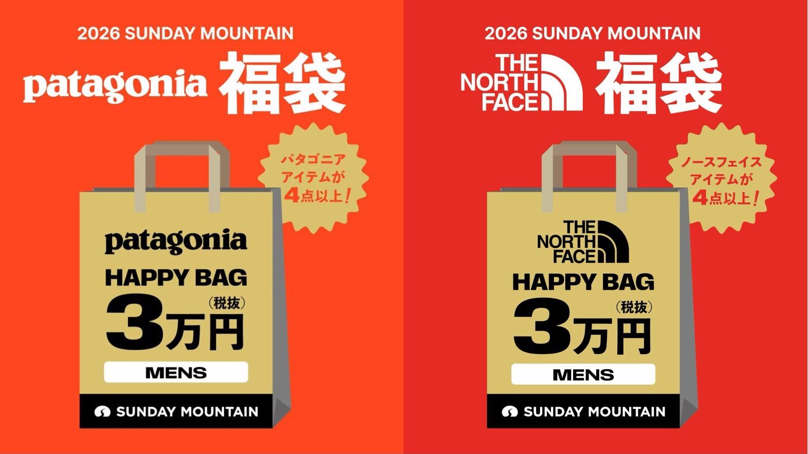 SUNDAY MOUNTAIN(サンデーマウンテン)の「福袋2026」の予約販売が2025年12月19日から開始されます。THE NORTH FACE(ザ・ノース・フェイス)の福袋が3種、patagonia(パタゴニア)の福袋が4種販売されます。詳細をレビューします。