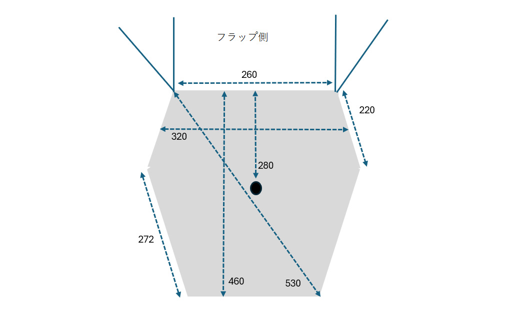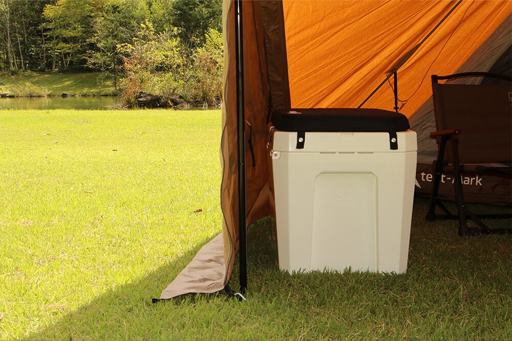 フロントフラップワイド本体だけでなく、スチール製の175/135cm調整可能ポール×1本、175cmポール×1本、スチールペグ×7、二股張り綱×2、樹脂キャップ&連結パーツ×2セット、収納袋が付属します。ポールで垂直に立ち上げるため、ハードクーラーなども無駄なスペースなく設置できます。