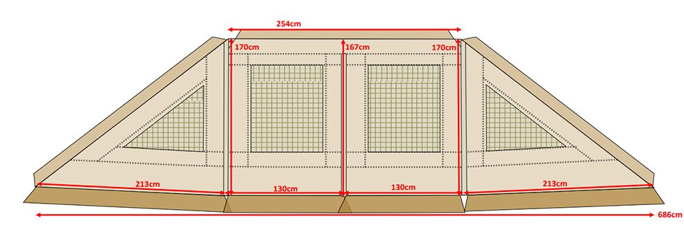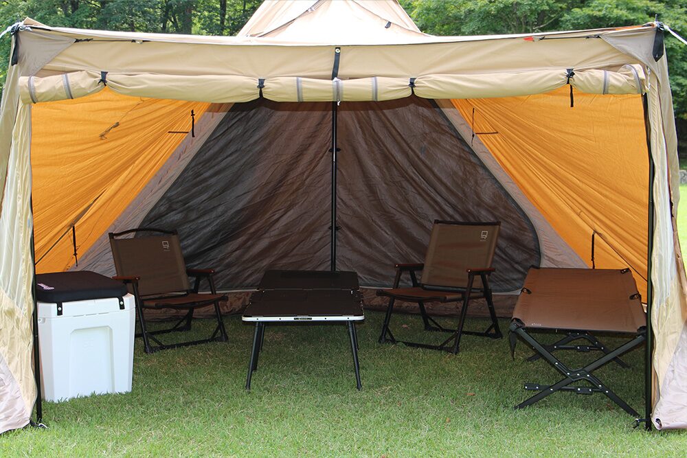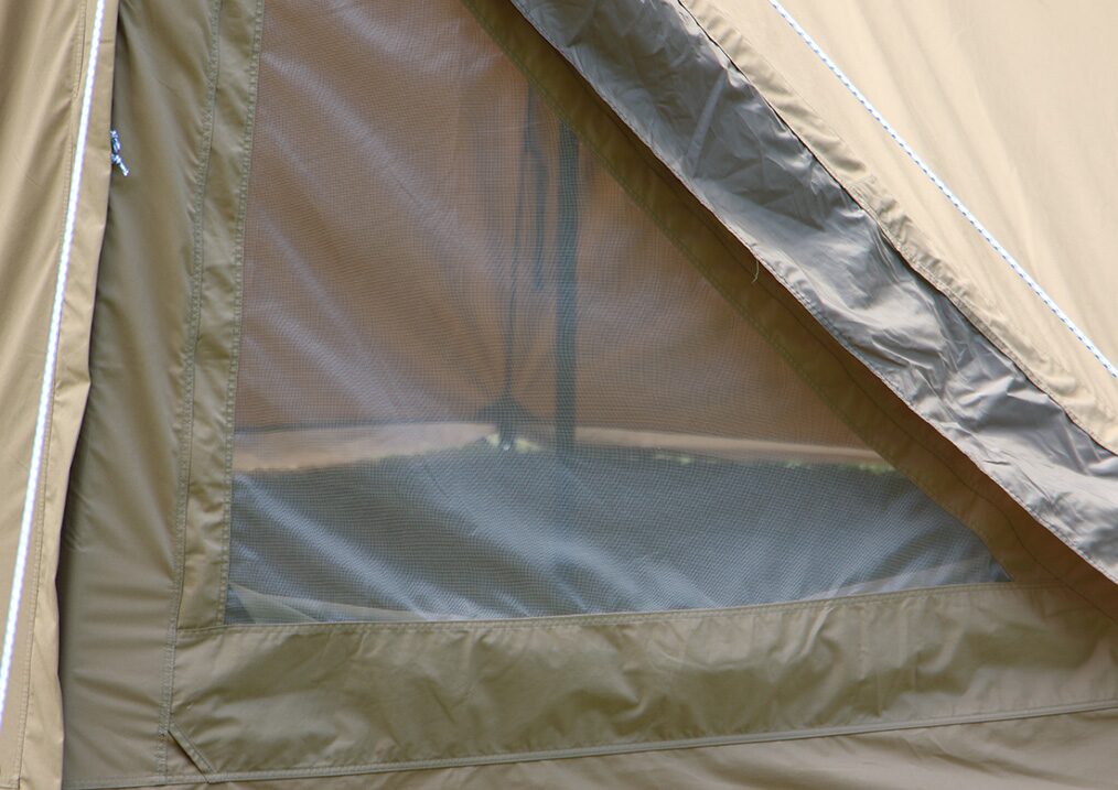 正面両面を巻き上げて開放的なスタイルも楽しめます。なお、フロントフラップワイドの構造的な問題として、屋根部分に傾斜がつかなくなり雨天時には雨水がたまりやすくなります。付属する1本のポールは伸縮仕様となっており、片面だけ高さを下げて雨水を流しやすくする工夫が図られています。