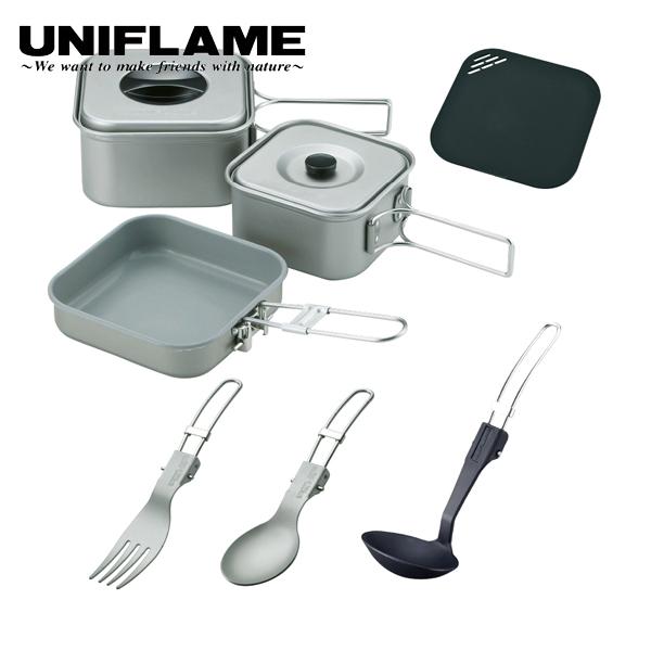 山クッカー角型3、マルチボード 角型3 ブラック、ちびレードル ブラック、FDスプーンTi、FDフォークTiの5点セットです。アウトドアで料理を始めるのにぴったりな特別セットとなっています。