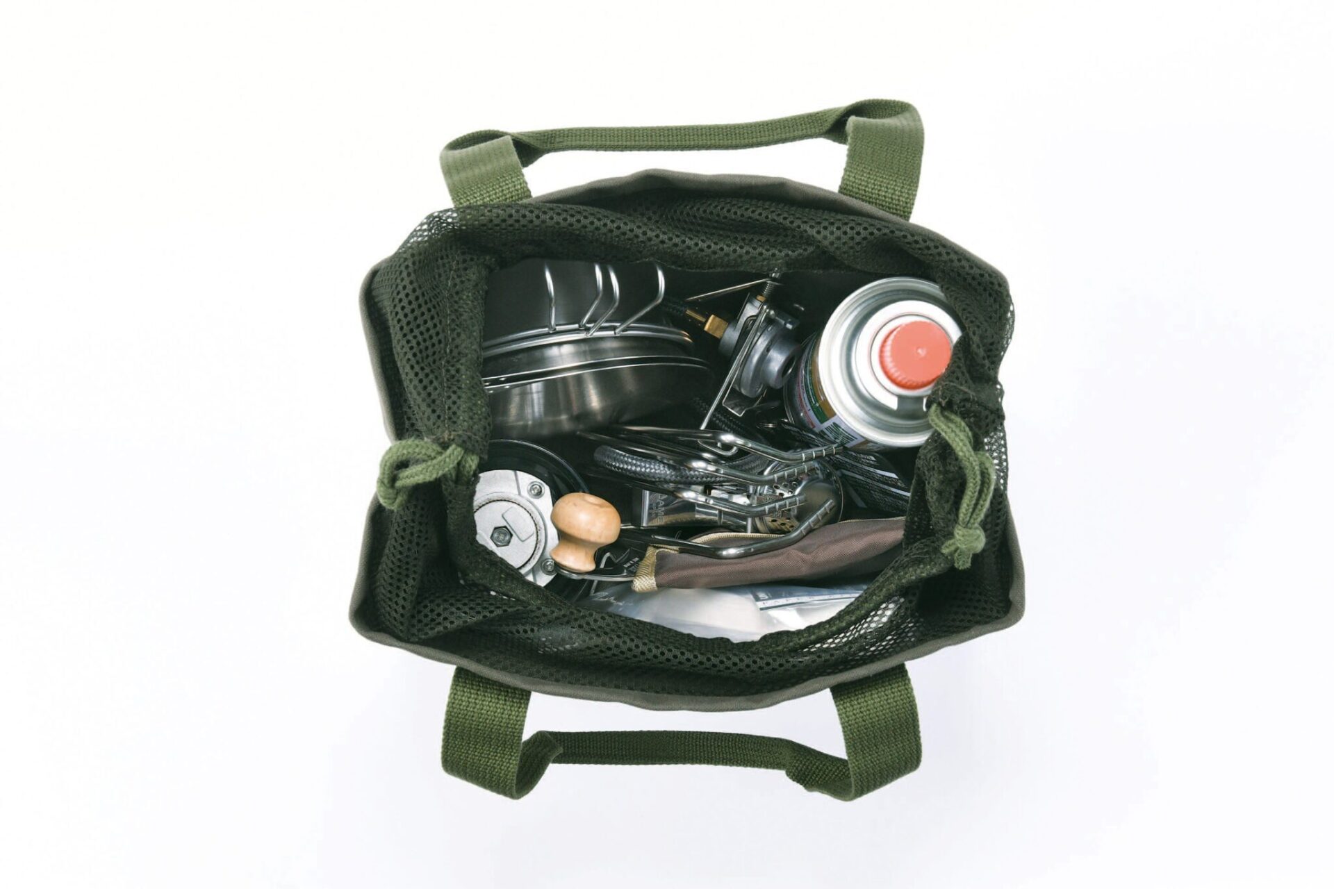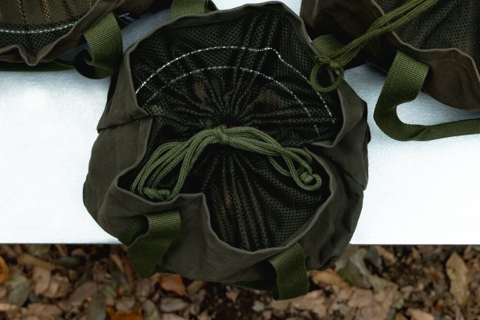 天面は巾着仕様になっており、中身が飛び出るのを防ぎ、メッシュ仕様のフタで通気性を確保します。