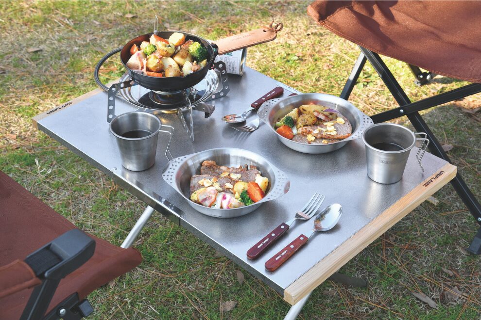 天板も焚き火テーブル同様熱やキズに強いステンレスが使われています。安心して熱した鍋やバーナーなどを直接置くことができ、特殊エンボス加工でキズが目立ちません。