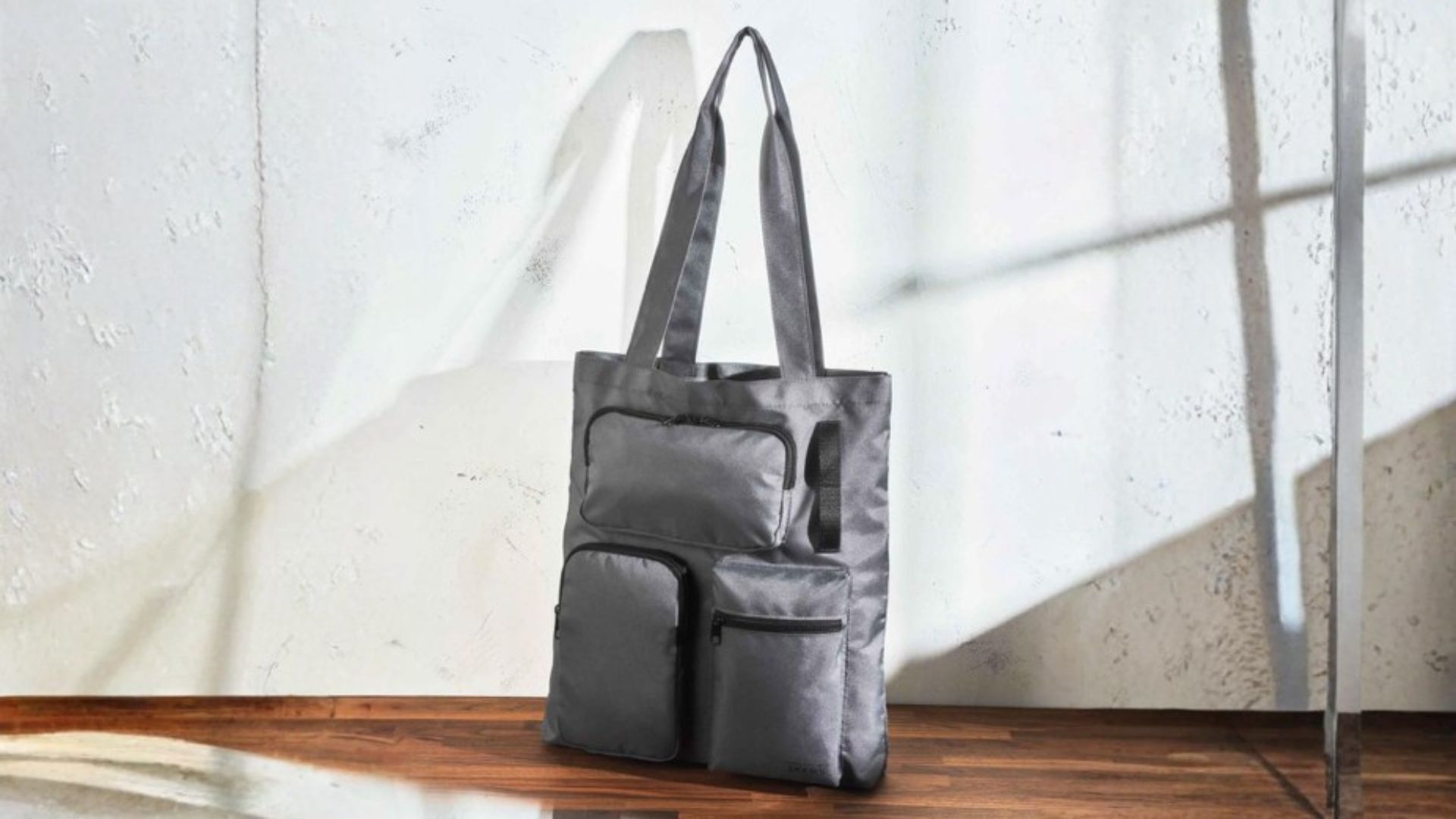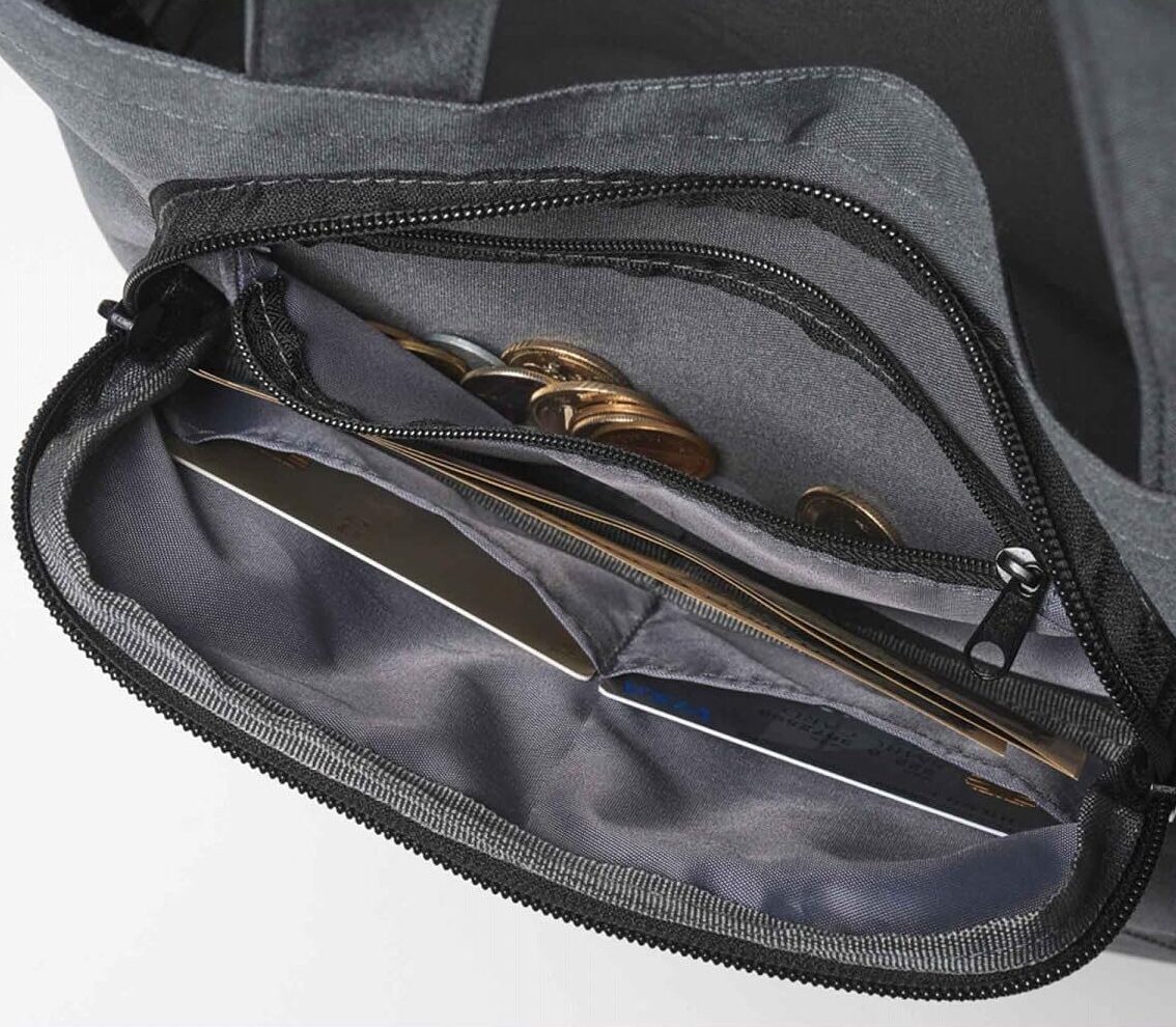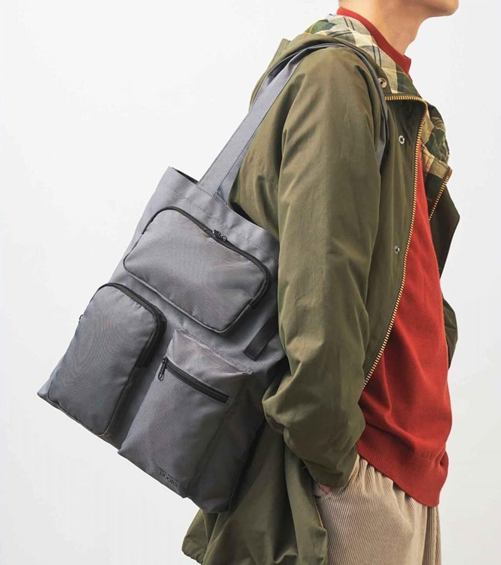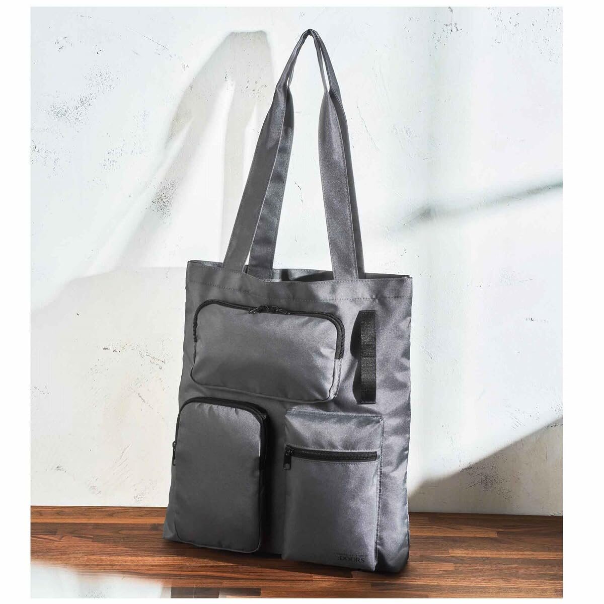 トートバッグの側面には、ファスナー付きの大きなポケットが3つ搭載されており、外ポケットだけで荷物の仕分けができます。