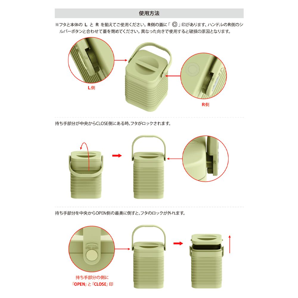 持ち手の方向を変えるだけで簡単にフタの開閉ができる構造は、これまでの真空ハイブリッドコンテナシリーズの構造を踏襲しています。
