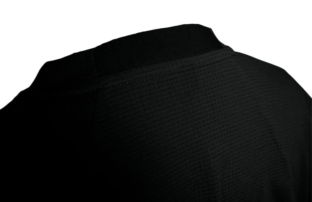 脇と首の後ろには、Xshelter暑熱αのドットショット加工生地を使用しています。ドッキングで通気性を向上させています。