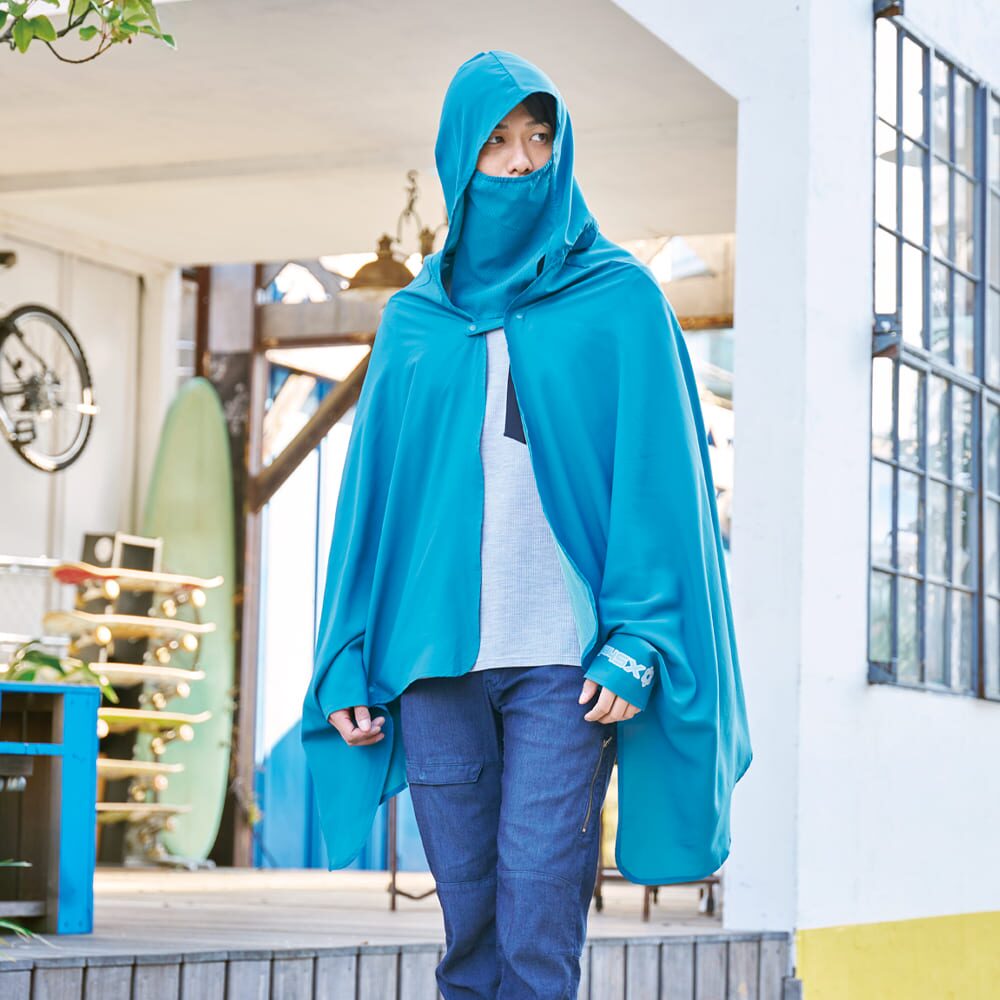 シーンに合わせて形を変えられる万能ポンチョで、スナップボタンで取り外し可能なフェイスガードが付いています。フリーサイズで、カラーはブラック、ホワイト、レイクグリーン、ストレートグレー、パステルレッド、コヨーテ、セージグリーンの7色展開です。