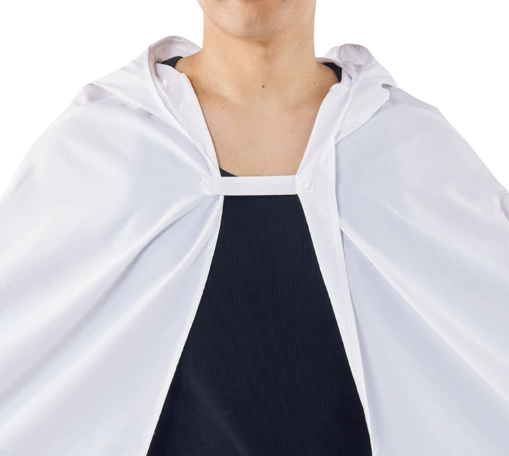 胸元のスナップボタンを留めればマントのように使うことができます。襟の内側にはハンガーループが付いており、一時的な保管として、フックなどに掛けておくのに重宝します。