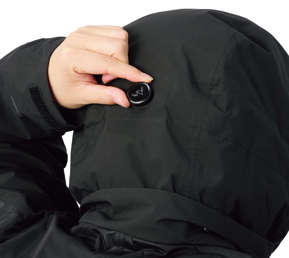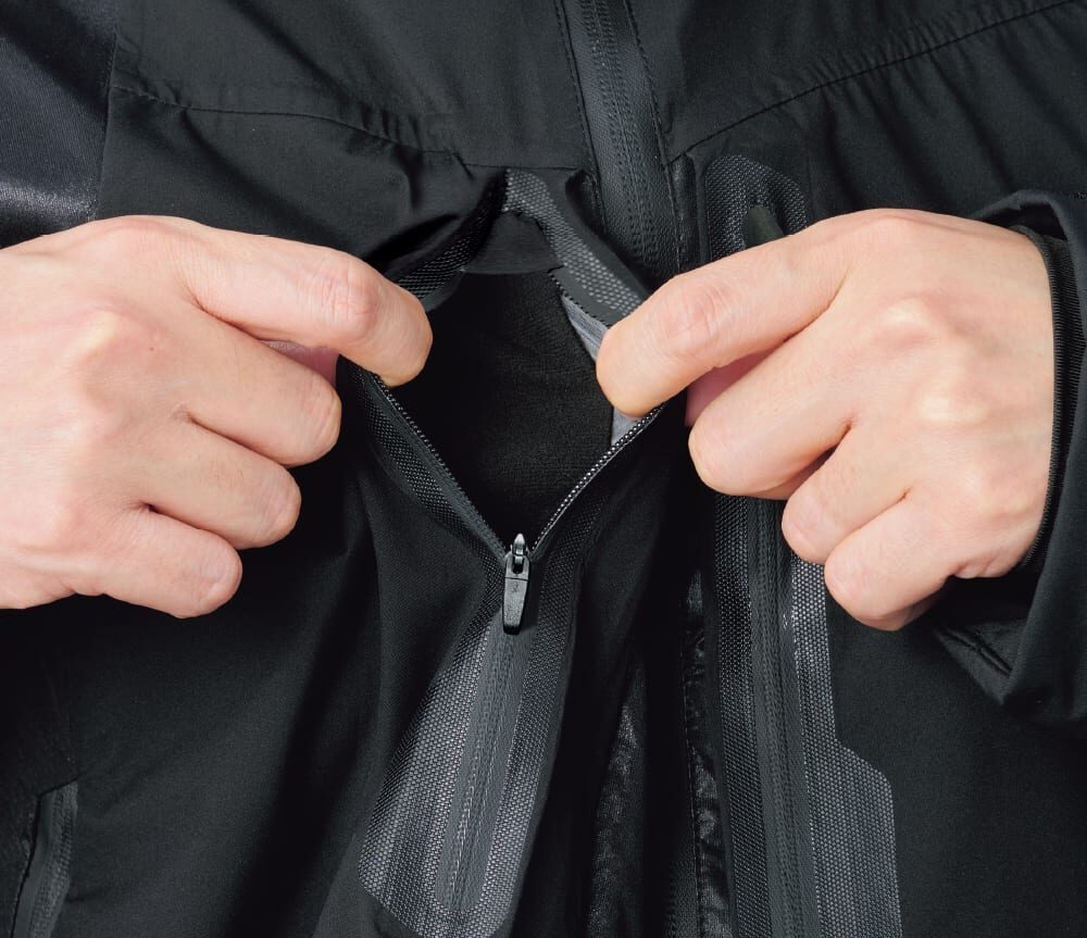 さらにジャケット内の蒸れを軽減できるよう、脇下にベンチレーションを搭載しており、フロントはファスナーを開けたままでもボタンで固定できるようになっています。