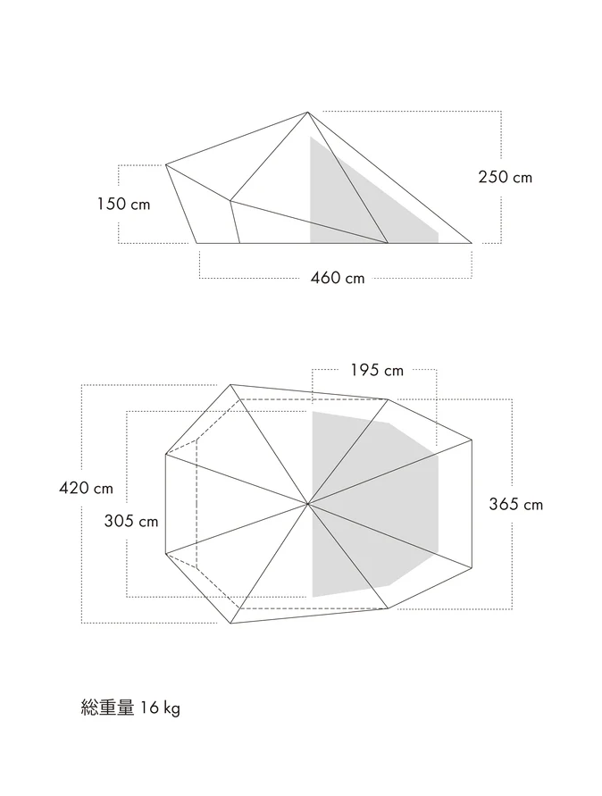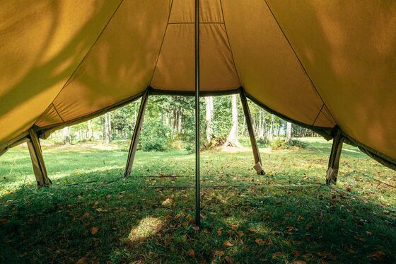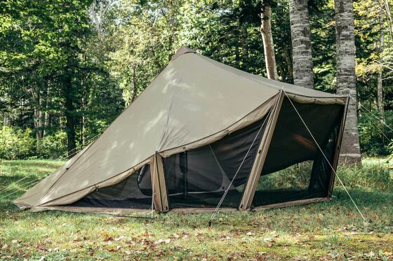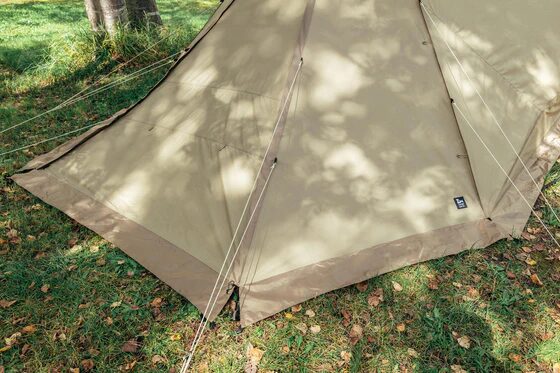 これまでのシリーズ同様、設営しやすいワンポール形状を基本としながらも、フロントポール2本、サイドポール2本で前面と側面を立ち上げることにより、広い居住空間を確保できます。前面のパネルは別途キャノピーポールを用意すれば跳ね上げてさらにリビングスペースを拡張できます。