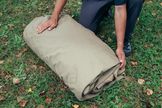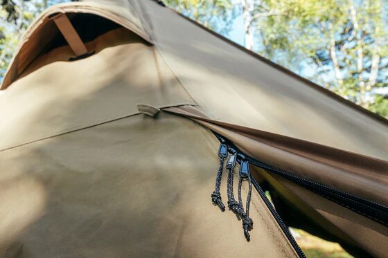 テント本体の素材には、綿35%、ポリエステル65%の混紡素材であるTC(ポリコットン)素材が採用されています。綿は化学繊維と比較して常温時の水分保有量が高く、火の粉で穴が開きにくい性質を持っています。遮光性も高く、結露の不快感も軽減します。