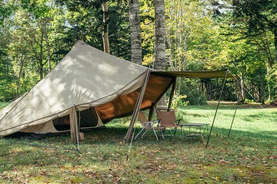 テント内に居ながらでも広範囲に景色を眺められるよう、パネルがワイドに開口するデザインになっています。各パネルは弧を描くように配置されており、リビングスペースのどの位置からでも景色を楽しめます。